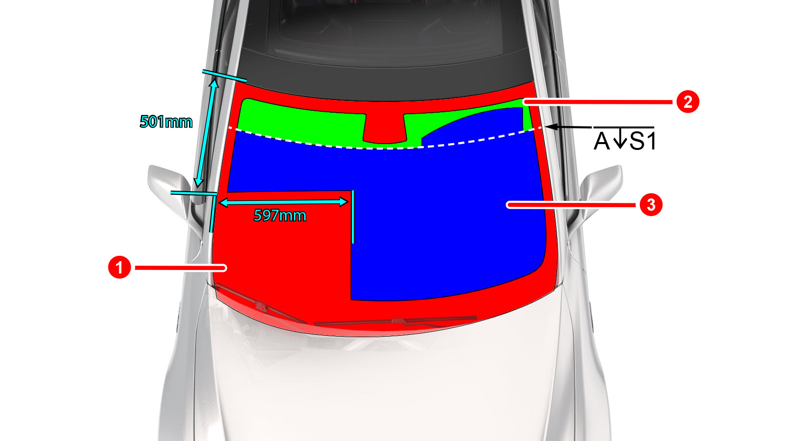 Area 2 (shown in green in the images above) Repair area 2 is a curved area from the edge of the upper Frit area down to the AS1 line (155 mm below the edge of the upper Frit area). |