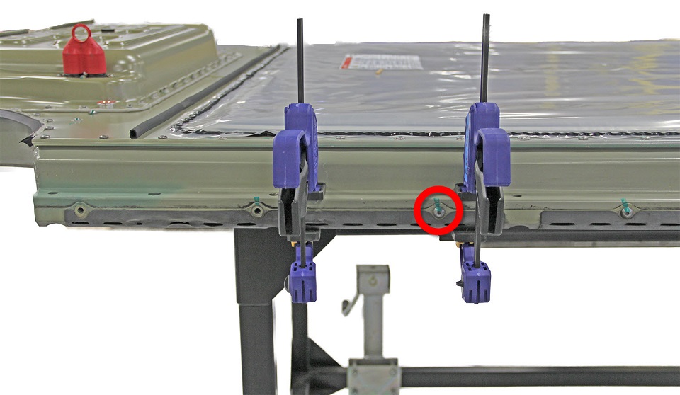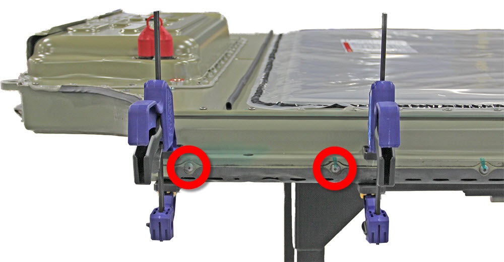 4. Release the clamp closest to the front of the HV battery and move it adjacent to the next remaining front bolt.