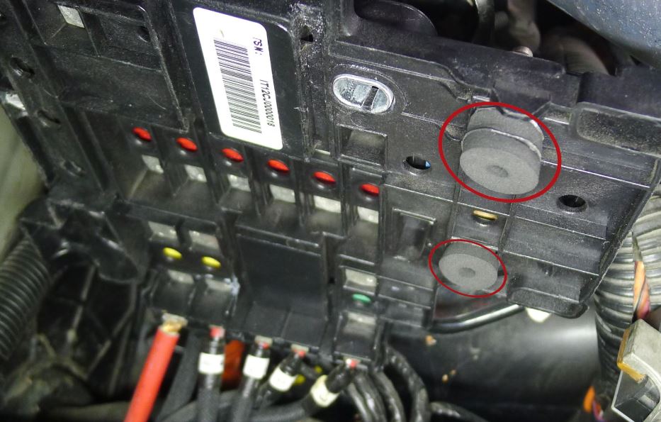 - Install a new nyloc nut that attaches the fuse box to the battery strap, making sure the gaskets are touching the top of the battery and support the pyro fuse studs.