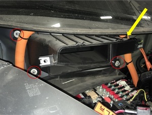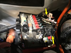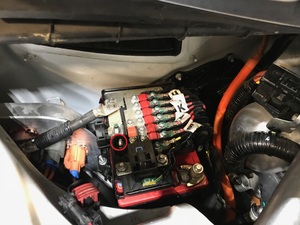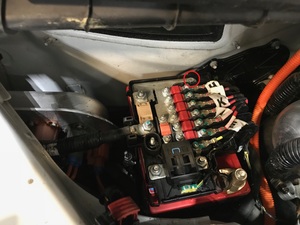 - Remove the nut (torque 12 Nm) that attaches the DCDC 12V positive terminal to the battery fuse box.