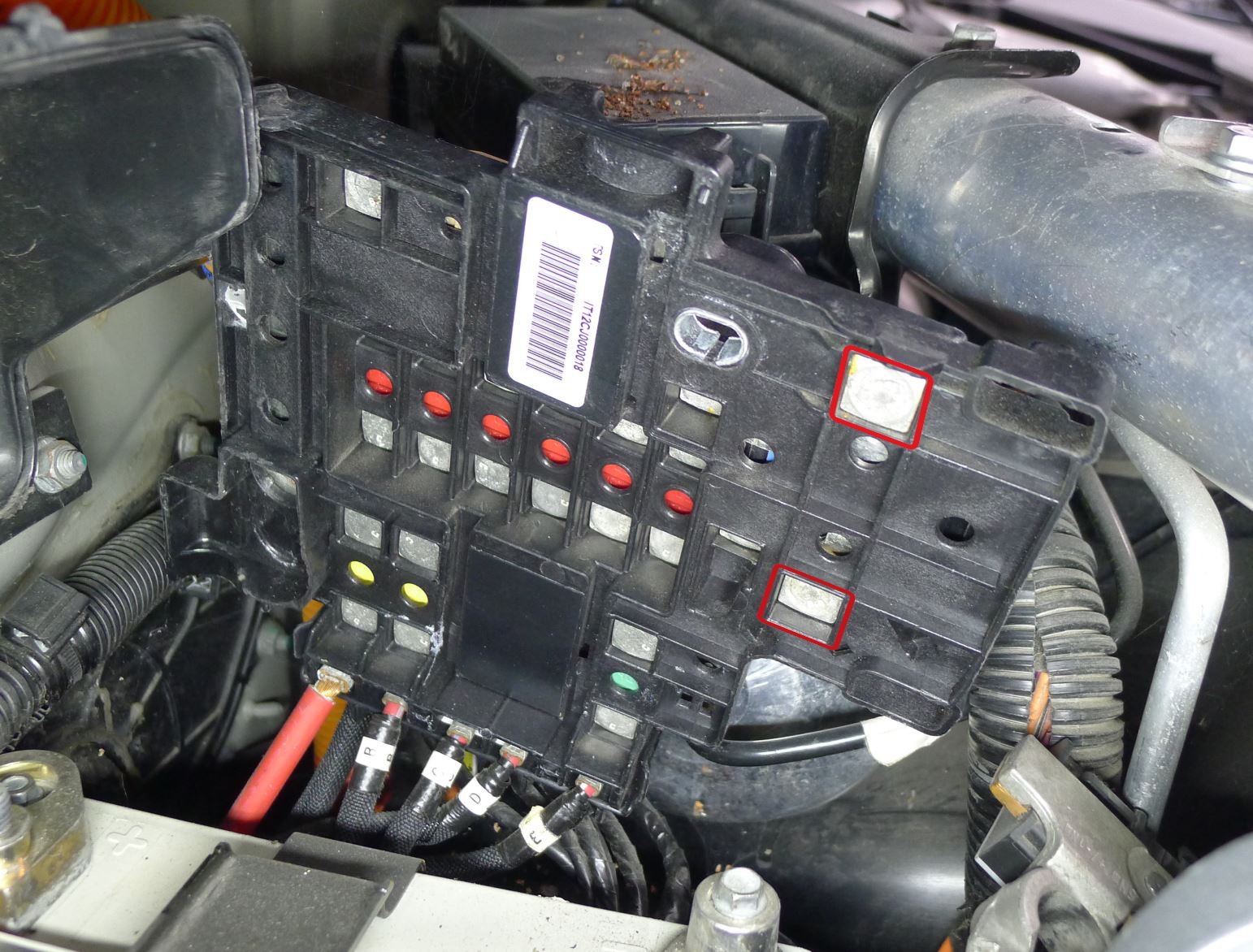NoteMake a note of the orientation of the front harness wires at the fusebox.Tip: To prevent the bolts from falling out of their respective terminals during fuse box removal, put the nuts back on one by one after the respective wire terminal has been removed.