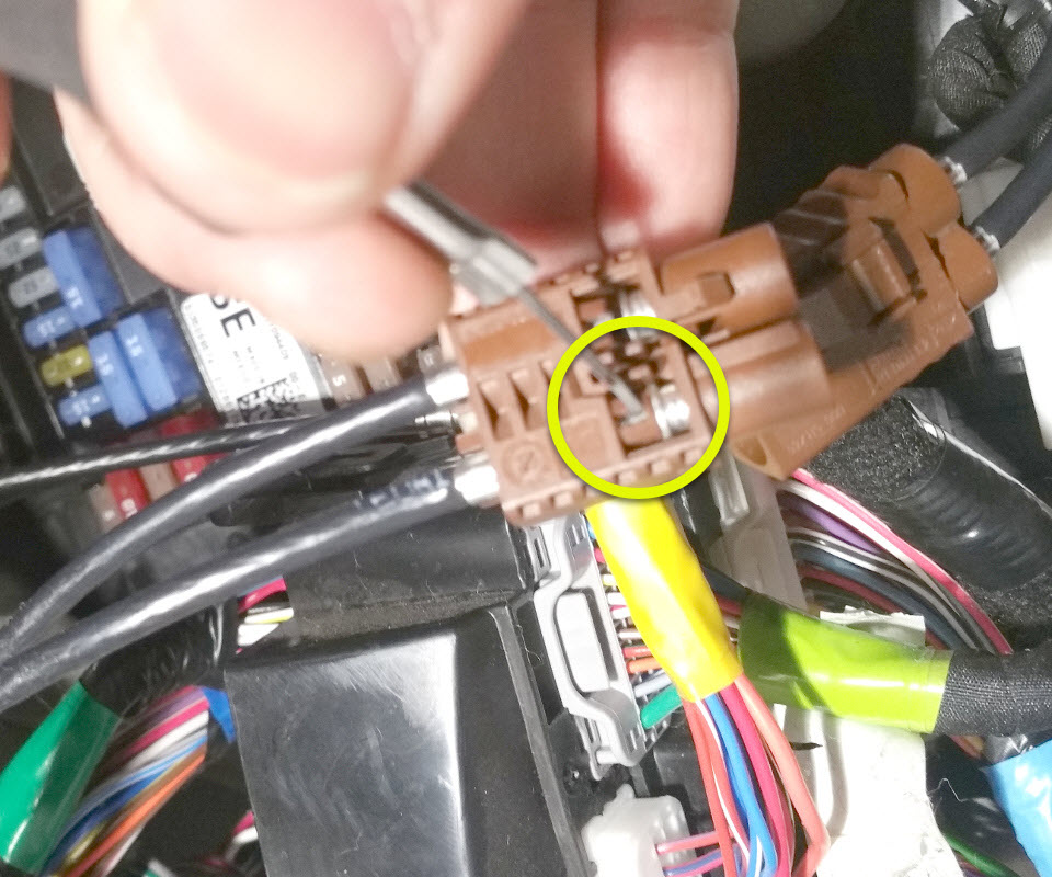 - Use the pin drag kit to carefully lift the locking tab of cavity 1 on connector X846M, and at the same time, pull the old coax cable from the connector.