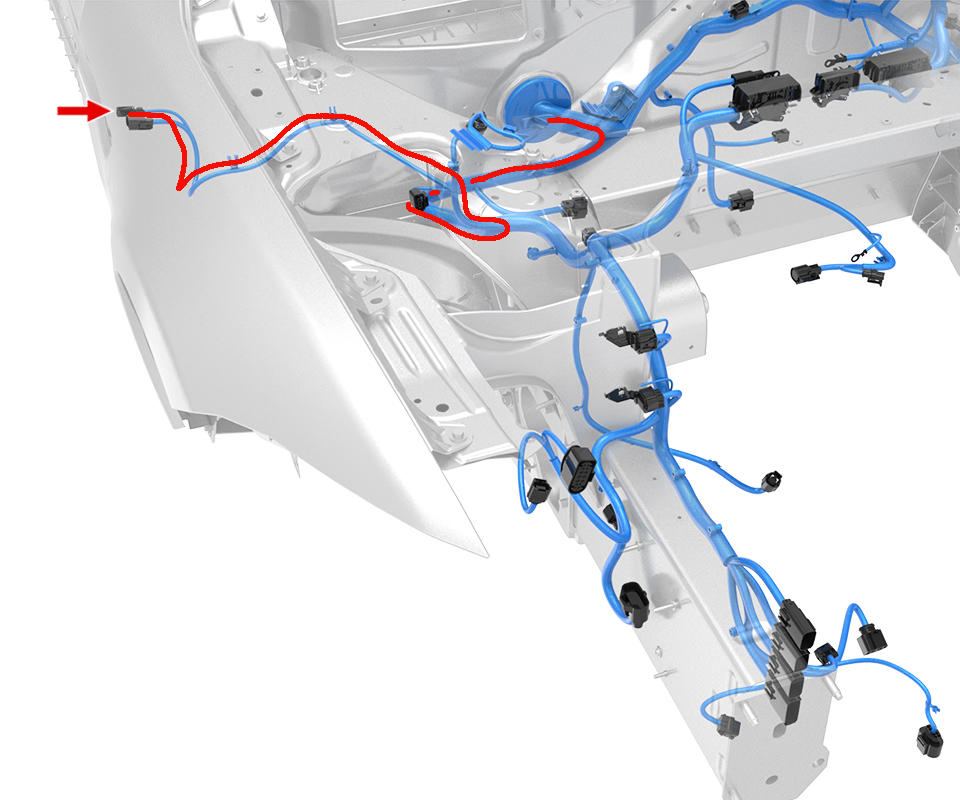 - Fold the passenger carpet rearward to gain access to the body electrical harness.