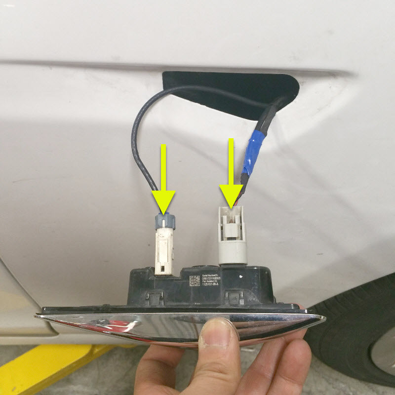 - Disconnect the repeater electrical harness from the RH side repeater connectors, and then remove the repeater assembly from the vehicle.