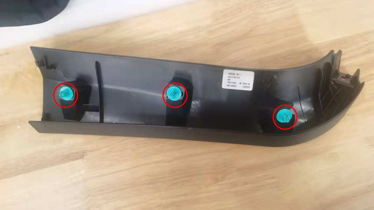 - Position the LH side rear window liftgate finisher to the tailgate, and then install the clips (x3) that attach the finisher to the liftgate.