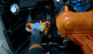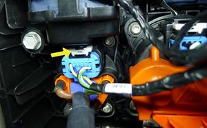 Connect Charge Port HV Harness CAN connector near coolant pump.