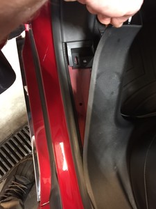 If the LH C-Pillar rear trim panel has a liftgate switch, reach behind the C-pillar rear trim panel and connect the trunk switch from the back.