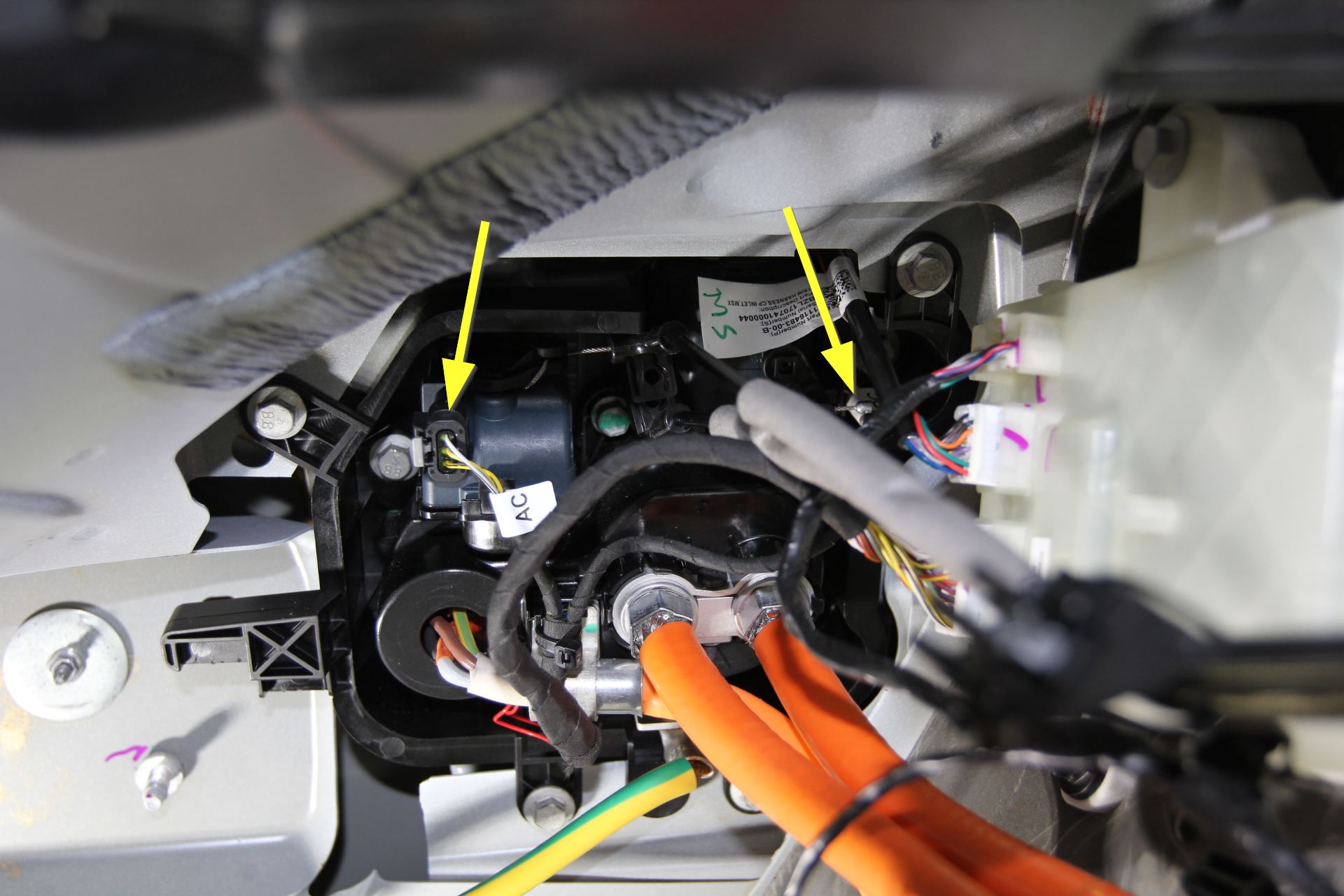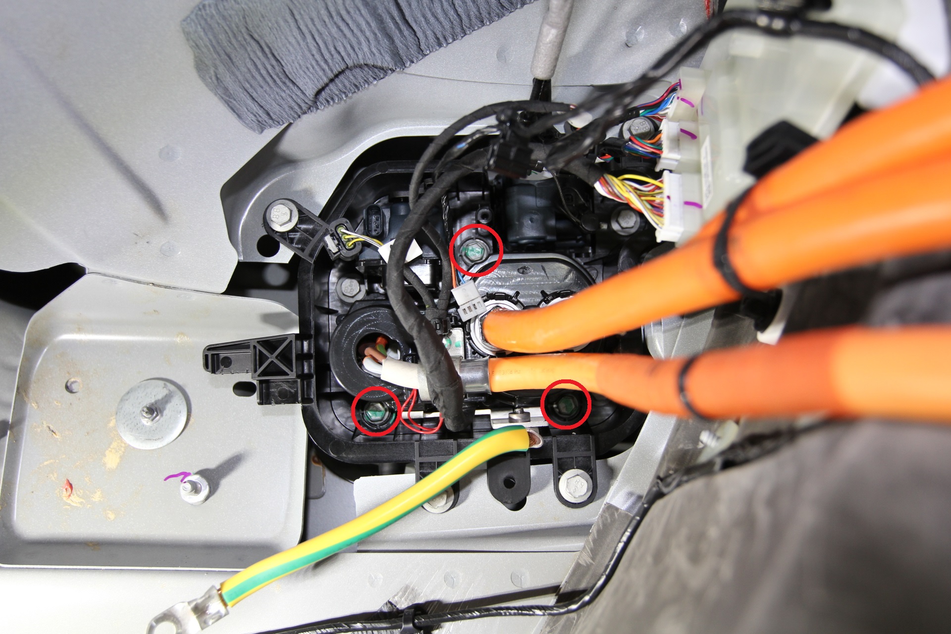 Remove the bolts (X3) to release the HV harnesses from charge port housing and move