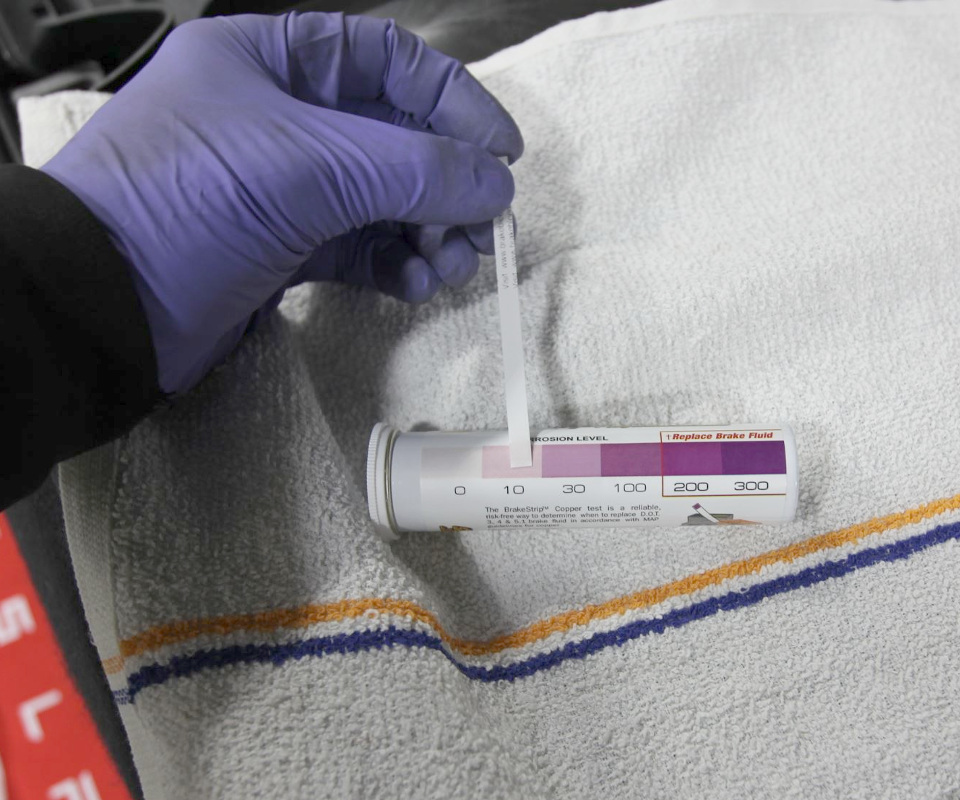 - Touch the square pad of the test strip to the fluid, remove the test strip from the wheel, gently shake the test strip over a shop towel to remove excess brake fluid, and start a 90 second timer.