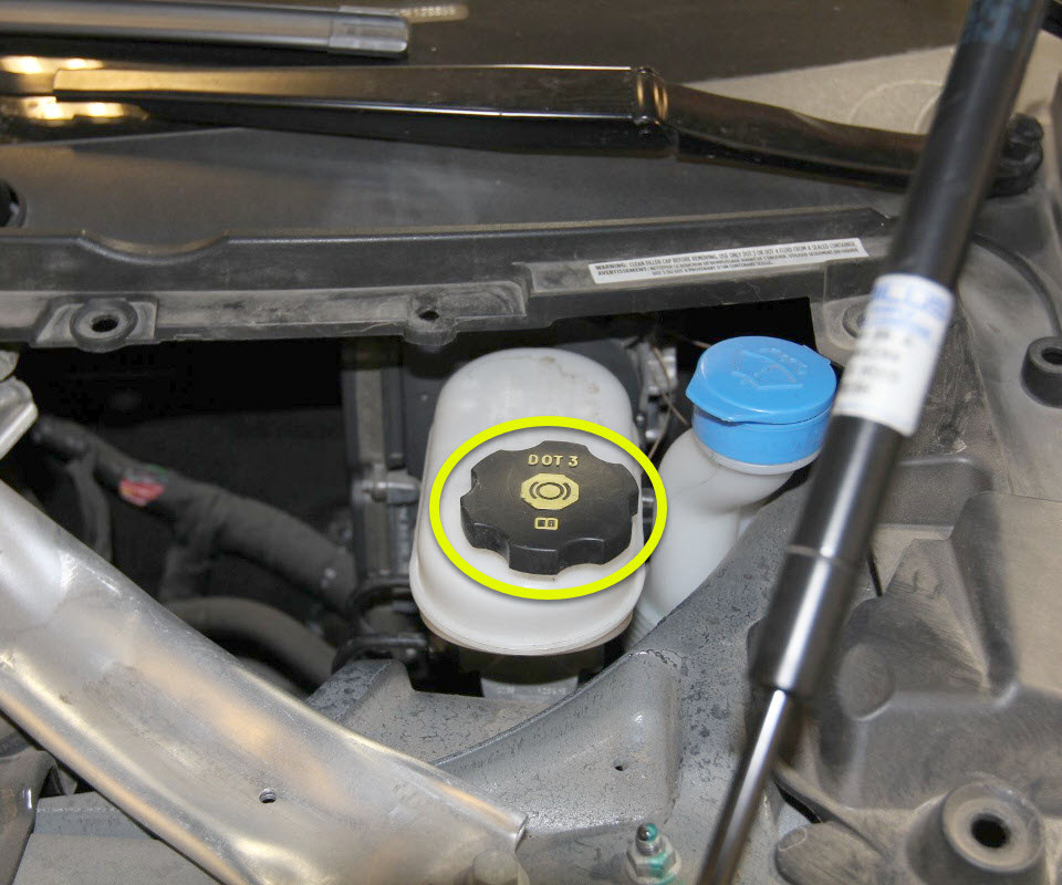 - Clean the area around the brake fluid reservoir and then remove the brake fluid reservoir cap.