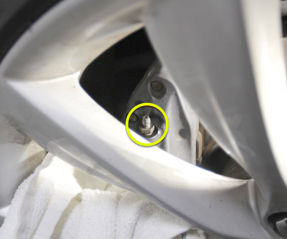 - Position a shop towel over the wheel spokes so as to protect from brake fluid.
