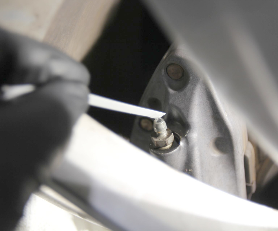 - Loosen the brake bleed valve only enough to allow a small amount of brake fluid to seep out, then close the valve.