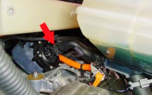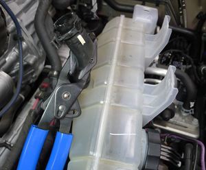 - Carefully lift up the coolant reservoir and disconnect the coolant level sensor harness.