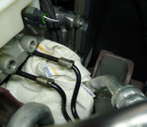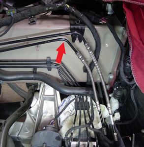 NoteSlide the lines underneath the A/C lines and coolant hose. Rotate upside down, gently pull up and out while guiding the brake lines between the coolant and A/C lines.