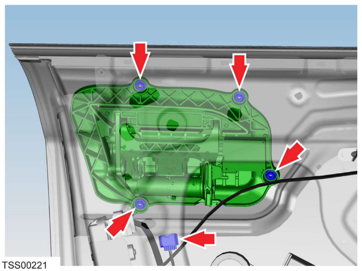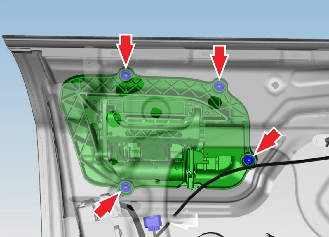 - Install the screws (x3) that attach the regulator motor to the door assembly (torque 2.4 Nm).
