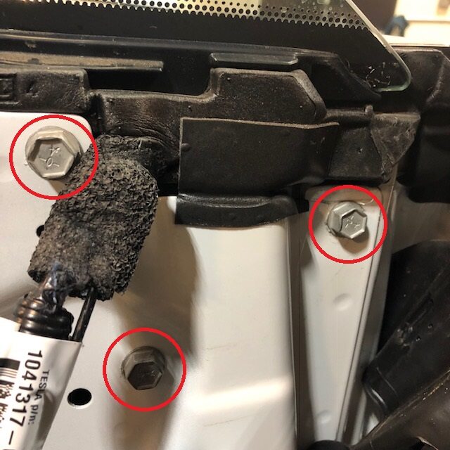 Note1x nut, 10mm, 7.5 Nm. Measure at the end of the door seal radius #1, right above the Tesla logo #3, and half way between 1 and 3.