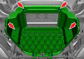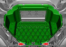- Peel back the carpeting at the front of the underhood storage unit. Release the bolts (x2) (torque 4 Nm).