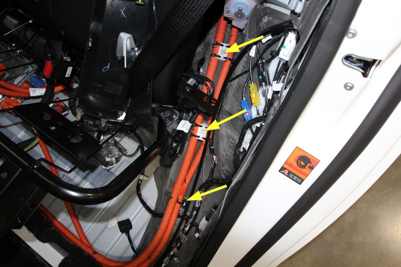 - Feed the charge port assembly through the trunk area of the vehicle to pass the harnesses through between the seat pivot and body.