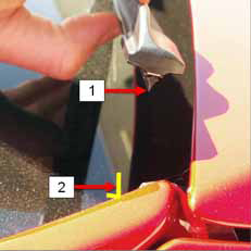 1 Wiper blade 2 Windshield mark (highlighted for visibility) - If the wiper blade either strikes the cowl or sits below the windshield mark, remove the wiper arm and reinstall it in a higher position (refer to procedure).