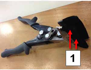 - Use a flashlight to look inside the hole in the front car cross seal. Inspect for an e-coated metal bracket that has black felt tape attached to the rear edge:CAUTIONTake care not to crack the glass when adjusting the tab.