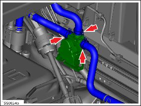 - Release the clips (x3) that secure the coolant hoses to the coolant valve. Release the hoses from the valve.