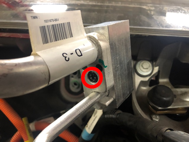 - Remove the nut that attaches the A/C lines to the EXV flush adapter.