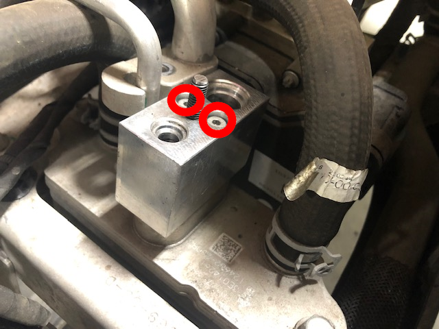 - Inspect the O-rings (x2) on the A/C lines to the chiller TXV and if they're damaged, replace them.