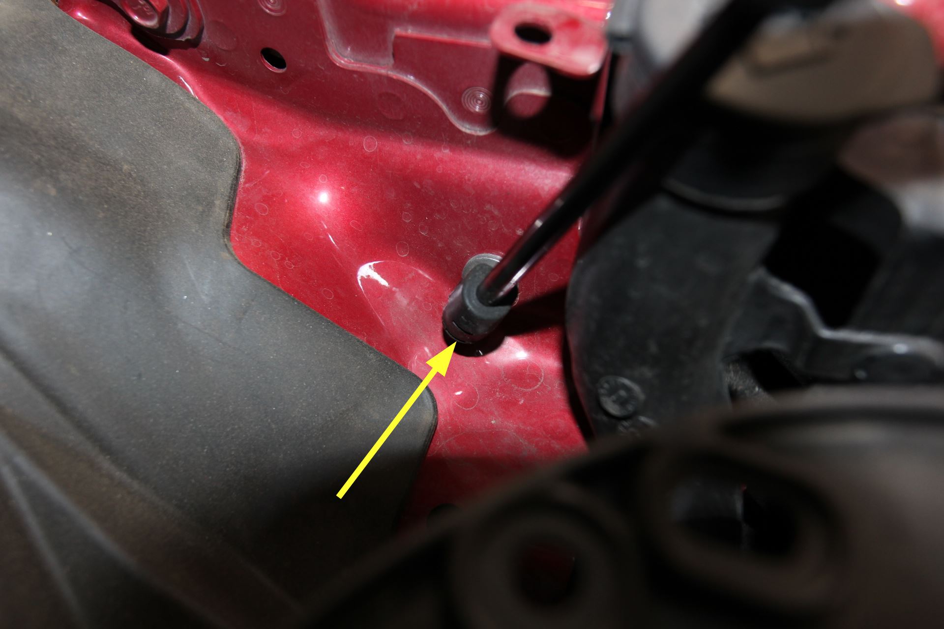- Position the LH hood gas strut on the body side ball stud, and then install the clip that attaches the strut to the body.