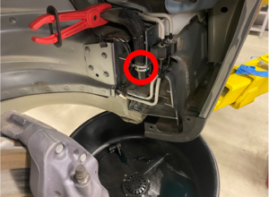 - Remove the nut (torque 4 Nm) and clips (x5) that attach the rear half of the LH front wheel arch liner to the body, and then move the rear half of the arch liner to the front side of the rotor.