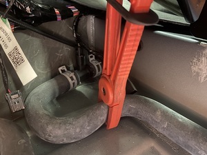 - Clamp the coolant hose that is connected to the charger and the rear drive unit.