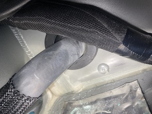 - Push the LH rocker side hose assembly through the rocker cavity, and then seat the grommet into the cavity.