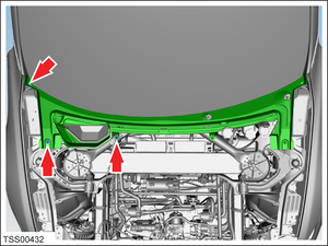 Note4x bolts, 13 mm, 8 Nm, 2x bolts, 10 mm, 6 Nm, before seating frunk attach hood latch cable.