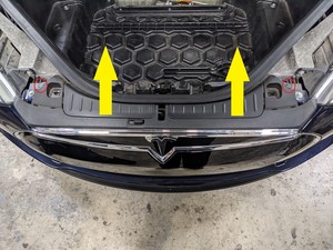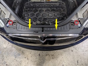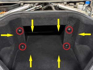 Note4x bolts, 13mm, 8 Nm, 2x bolts, 10mm, 6 Nm, Lift frunk slightly to remove the hood latch cable then remove frunk