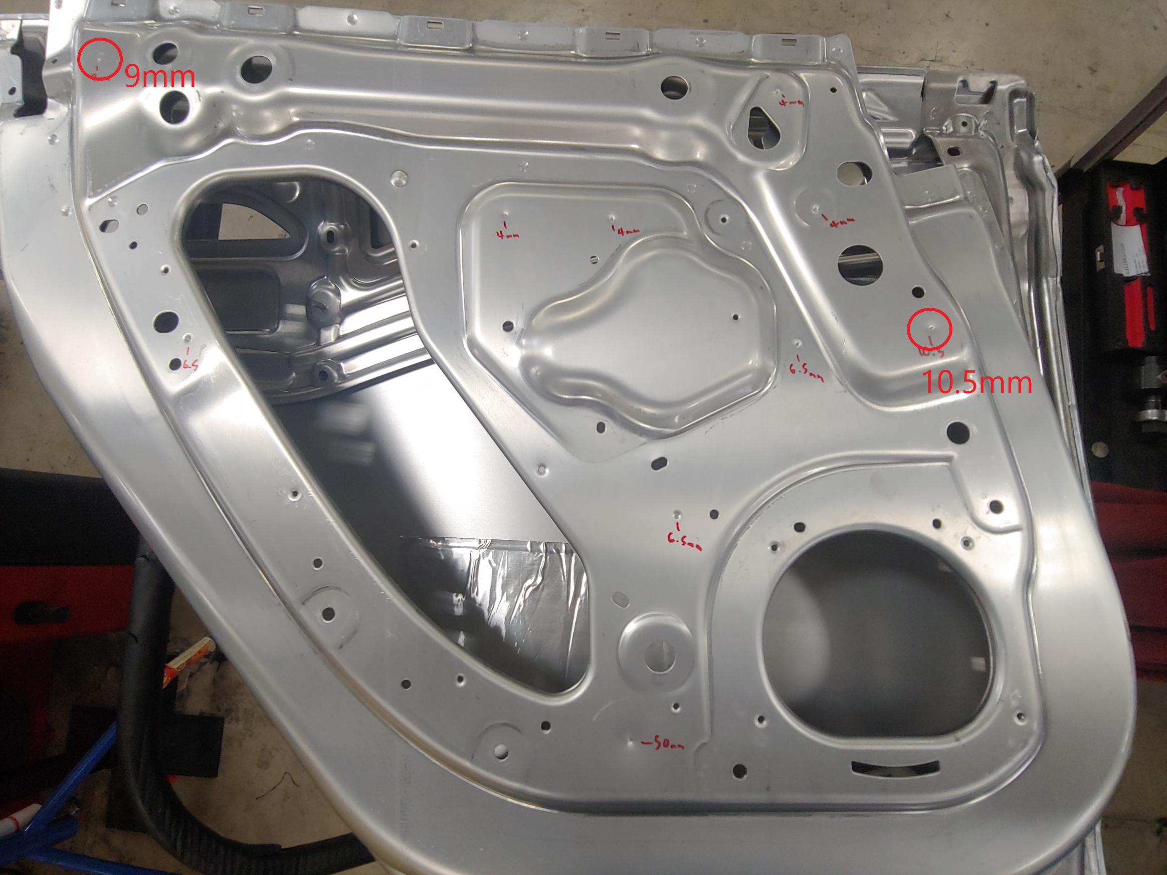 - Drill a 9mm and a 10.5mm holes for the door panel clip and door panel dowel pin as shown.