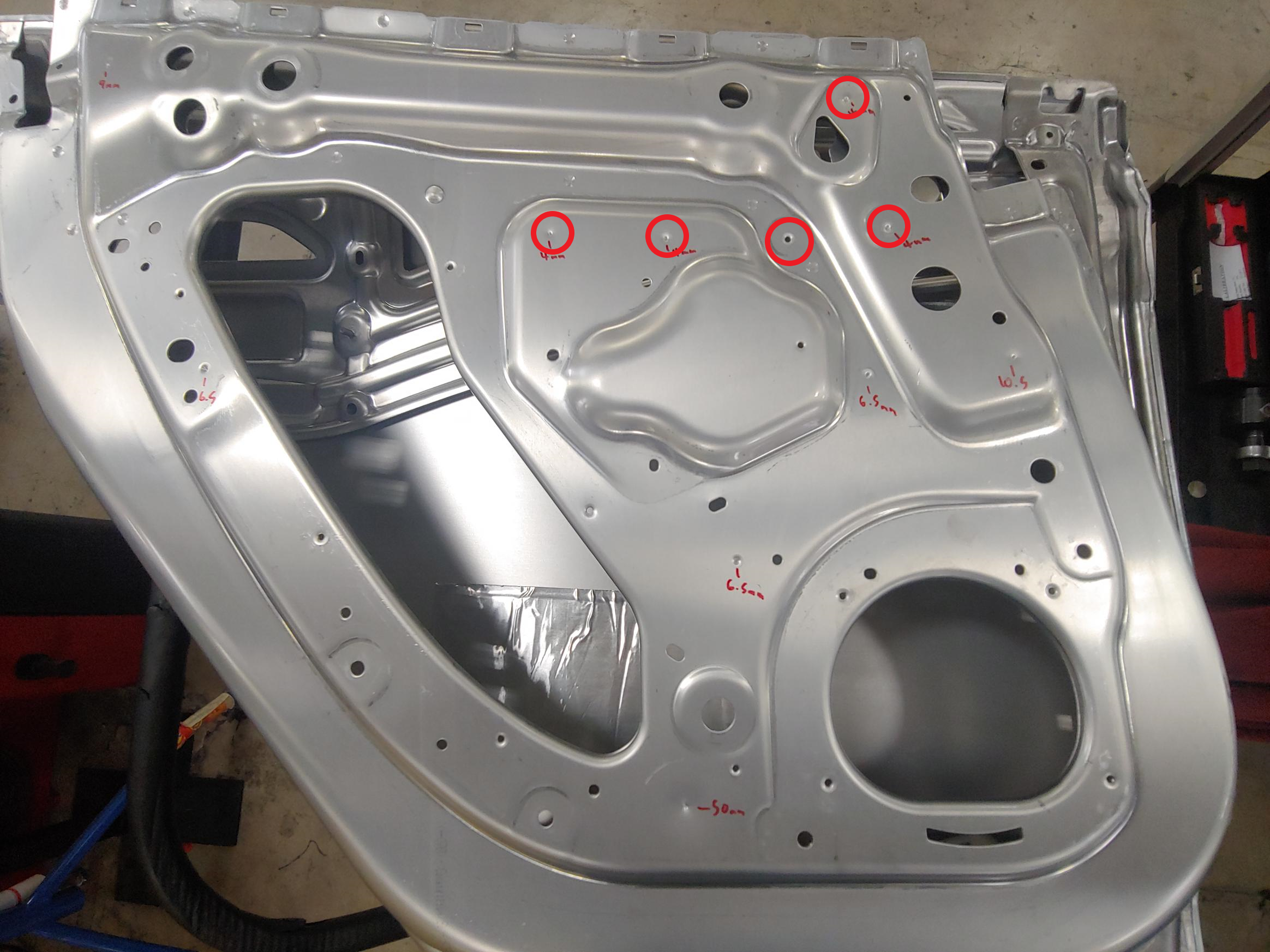 - Drill three 6.5mm holes for the door harness clips as shown.