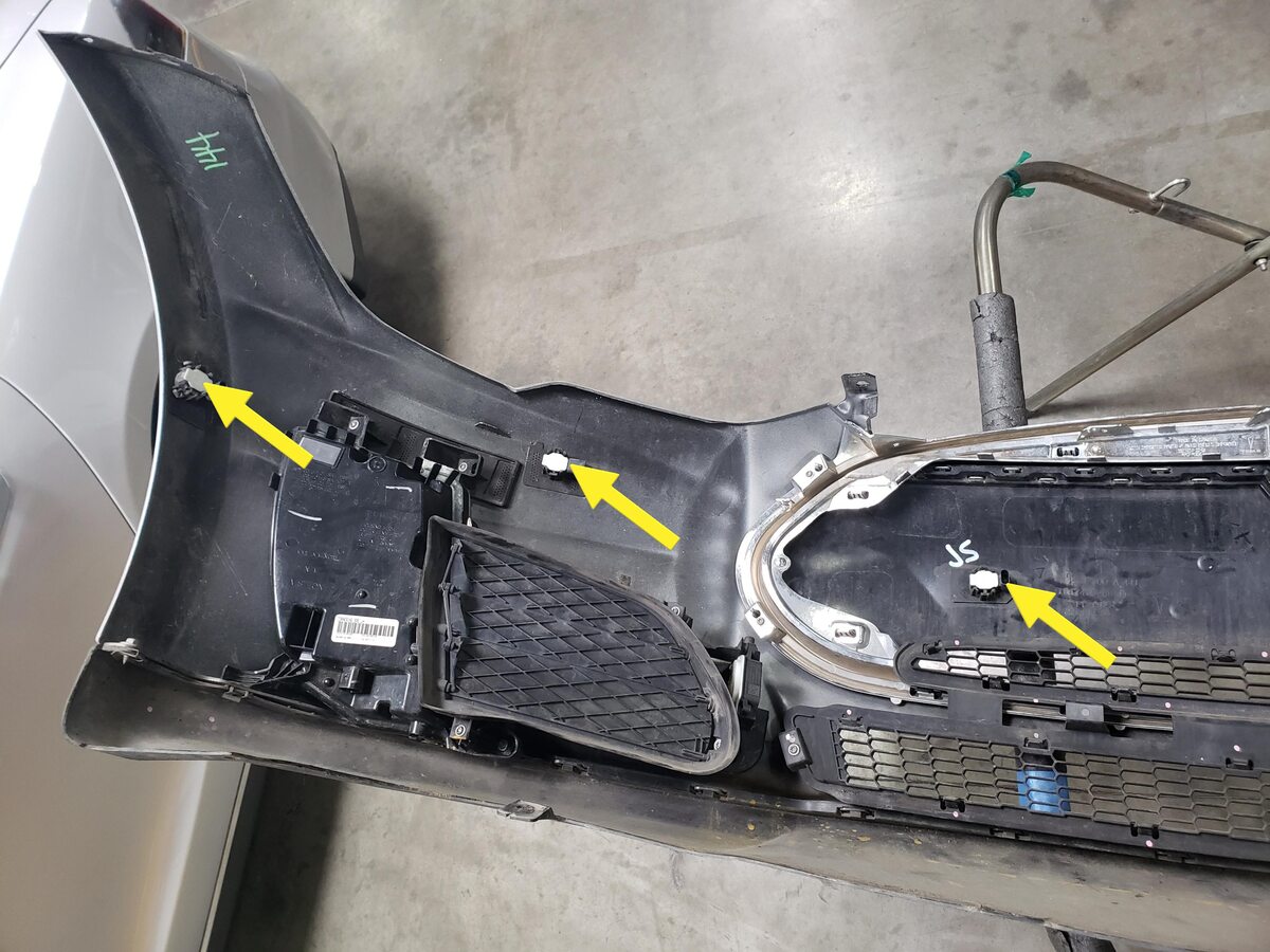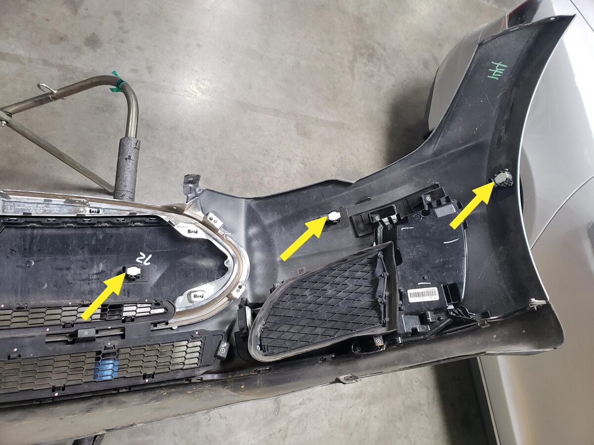 - Remove the parking sensors (x6) from the front fascia assembly, if equipped.
