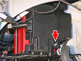 - Remove the nut that secures the fusebox to the fusebox bracket (torque 5 Nm).
