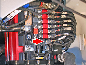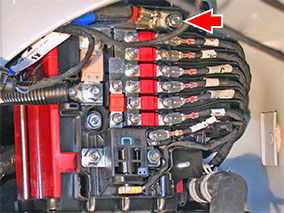 Remove the nuts that retain the small-gauge cables and fuses at the RH side