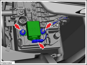 - Remove the nuts (x2) that secure the pyrotechnic fuse (torque 12 Nm). Disconnect the pyrotechnic fuse connector.