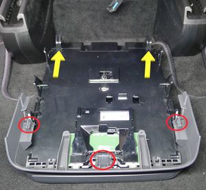 Release the clips (x3) that attach the center console rear cup holder assembly to the