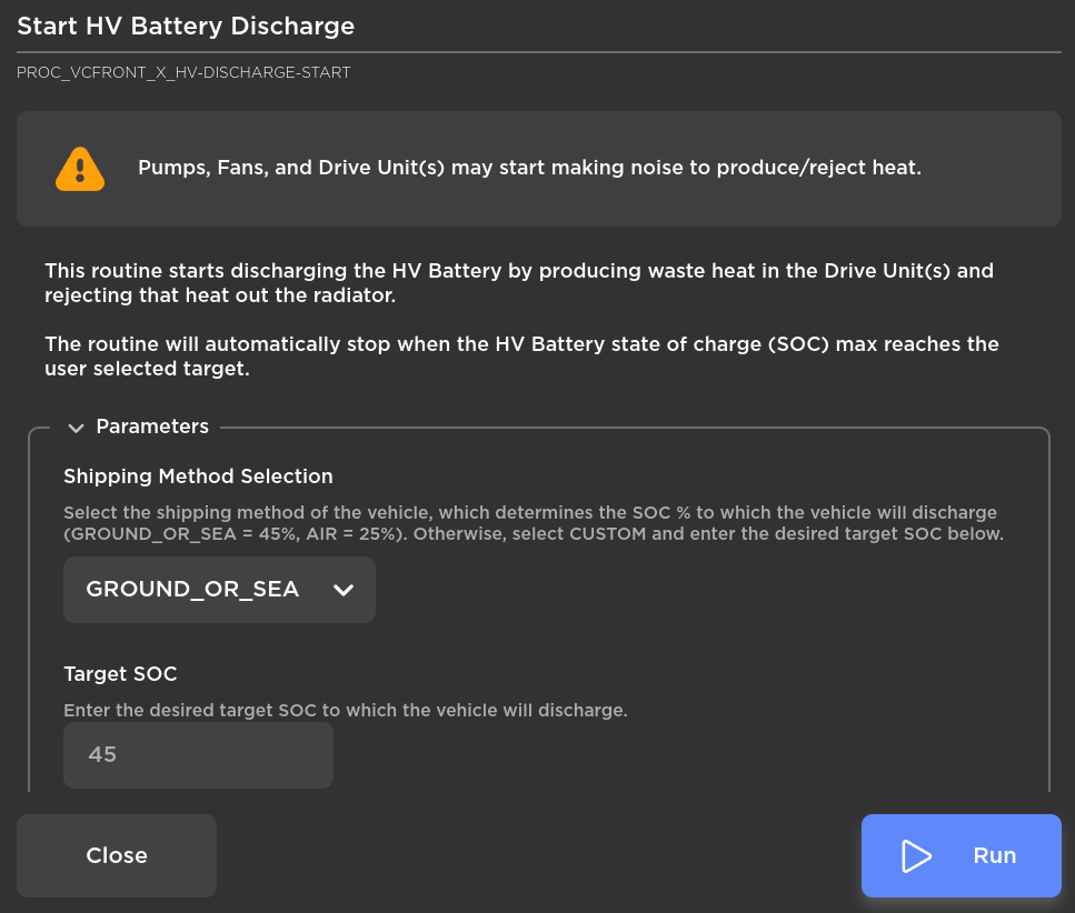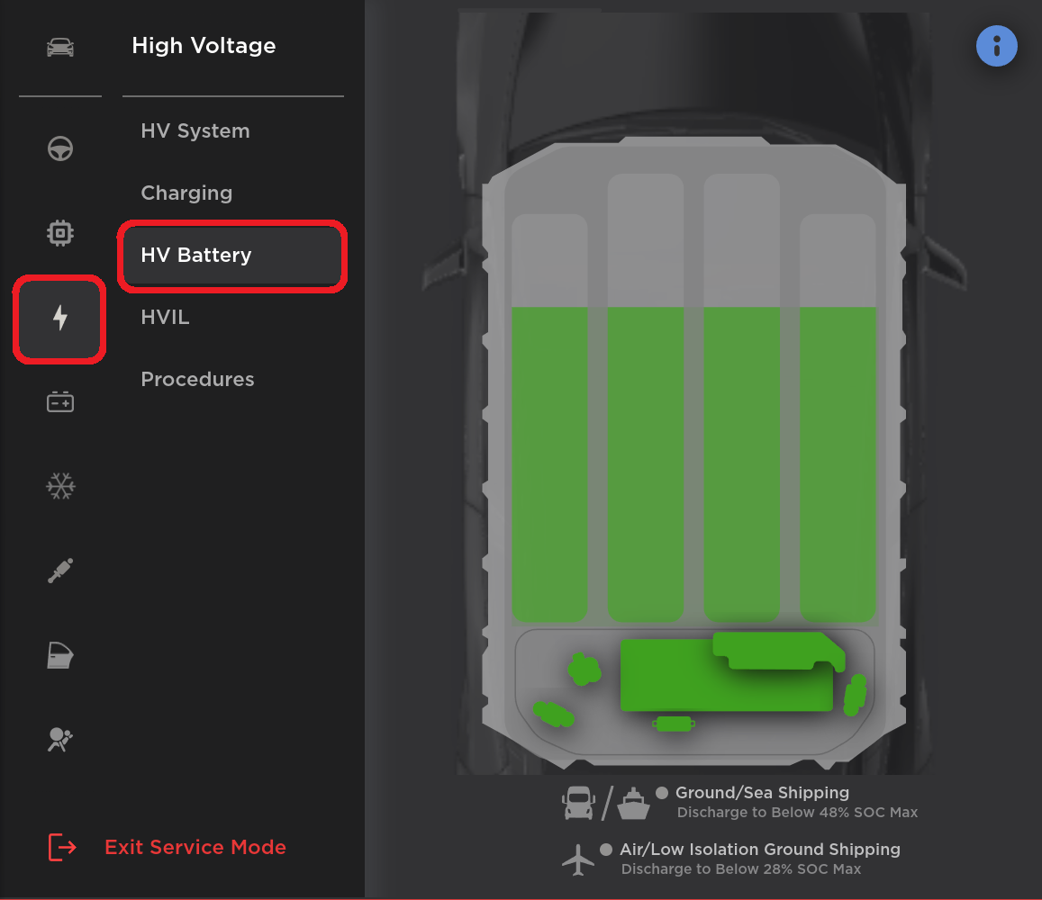 WARNING: To conform with local laws, High Voltage Lithium Batteries must be discharged before packing for shipment. Additionally, HV batteries must be discharged before being put into storage. HV batteries to be shipped must have a State of Charge (SoC) of less than 30% or 50%, depending on the region. If the method of shipment is unknown or uncertain, or the battery is to be stored, it is recommended to discharge the HV battery to less than 30%.
