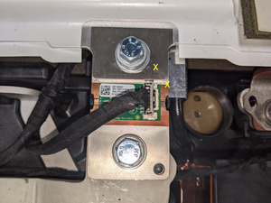 - Remove and discard the bolts (x2) that attach the HV battery shunt to the busbars.