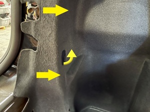 - Position the trunk side trim properly, connect the connector, insert the trunk tie down ring and install the clips (x4) that secure the trunk side trim.