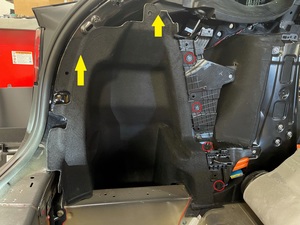 - Remove the clips (x4) that secure the trunk side trim, release the trunk tie down ring, disconnect the connector, and then remove the trunk side trim from vehicle.