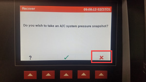 NoteConnect couplers to vehicle, Note the amount of refrigerant and oil recovered, mark oil drain bottle oil level (use a piece of tape marking the fluid level), Open couplers by turning clockwise, Using Main Menu > Recover > Verify hose connection, Machine will chime once process is complete, Vehicle may be left unattended, Note or print the amount of refrigerant and oil recovered, Refrigerant recovered should be ~2.24 lb (1.02 kg), Oil recovered should be ~0.3 oz (8.87 mL), If drained oil level increased more than 1.01 oz (30 mL) refer to drained oil loss chart.