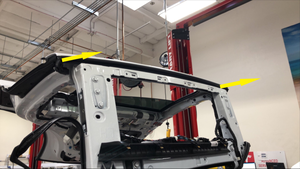 Position the LH rear door cantrail seal onto the door assembly, and then install the bolts (x4) that attach the sides of the seal to the door assembly.