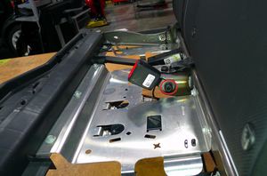Remove the bolt that attaches the LH 2nd row buckle to the seat frame, and then remove the buckle from the seat.