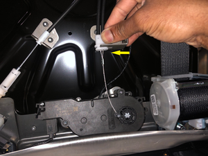 - Connect the LH 3rd row seat recliner actuator cable to the actuator pulley.