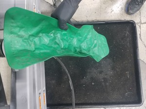 - Position a foldable funnel to guide coolant from the rear drive unit inverter inlet to the coolant catcher.
