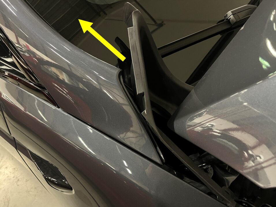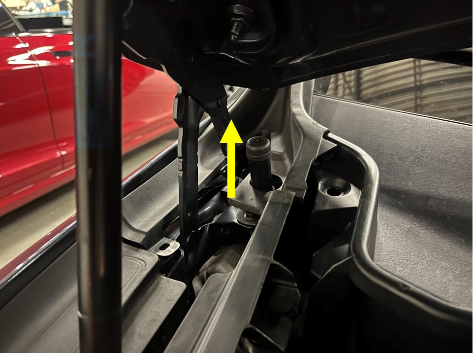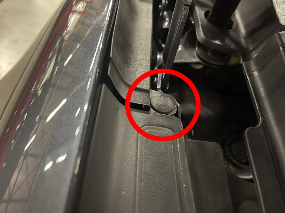 - Remove the clip that attaches the active hood hinge cover to the vehicle.